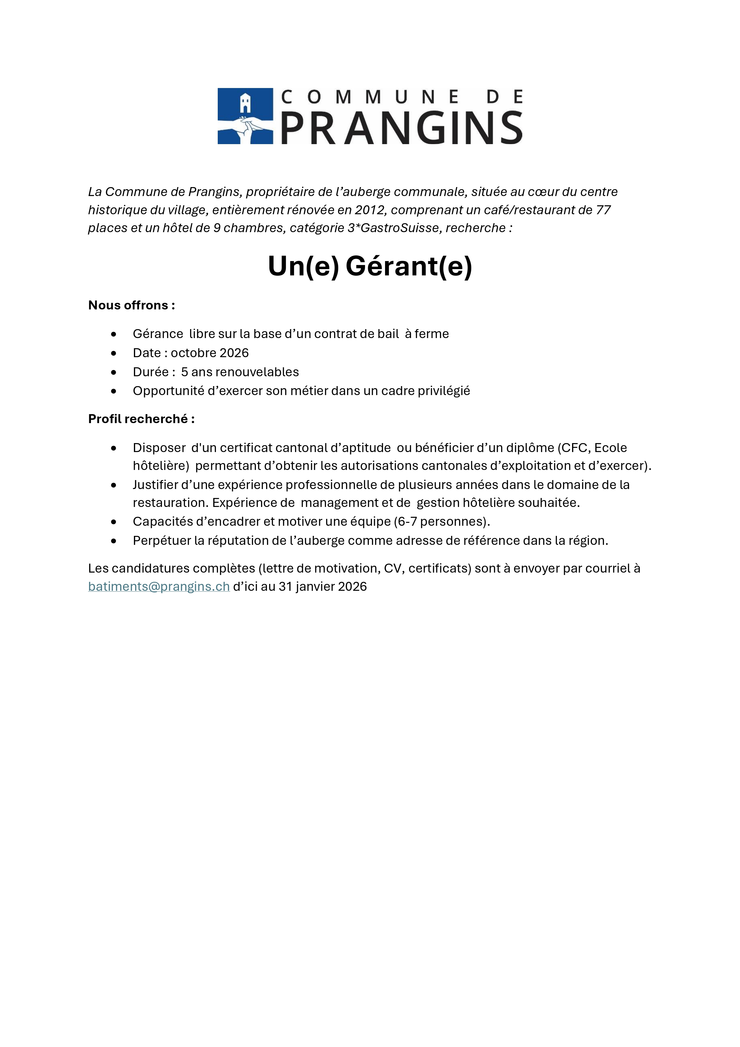 Annonce Auberge communale - Un(e) gérant(e)